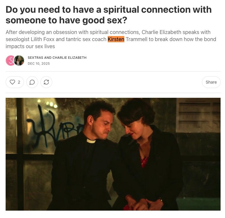 Top 100 Best Dating Podcast Media Conversations with Kirsten Why do Men (unintentionally) Turn Women OFF? The Powerful Connection Between Sex and Money Tantra, Drive and Confidence in Men's Sexual Mastery Do You Need A Spiritual Connection with Someone To Have Good Sex? Sex Tips for Shy Guys